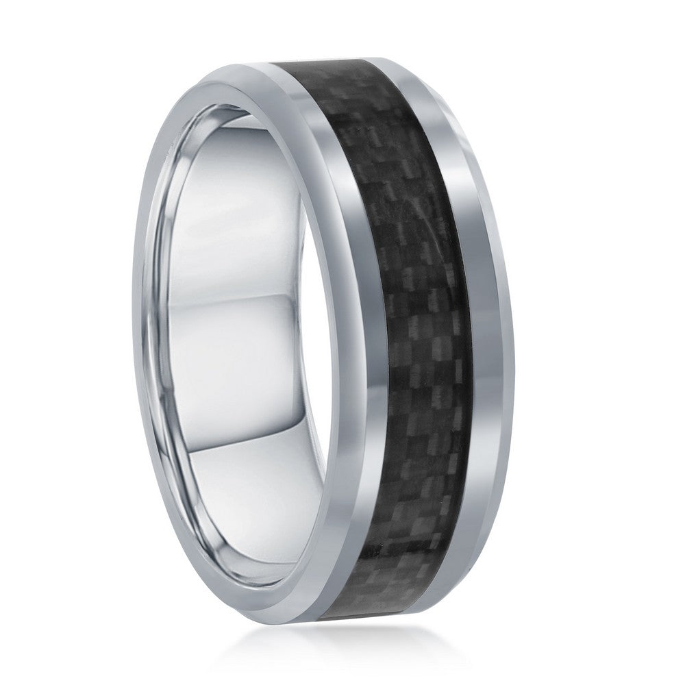 Silver Tungsten Ring W/ Black Carbon Fiber