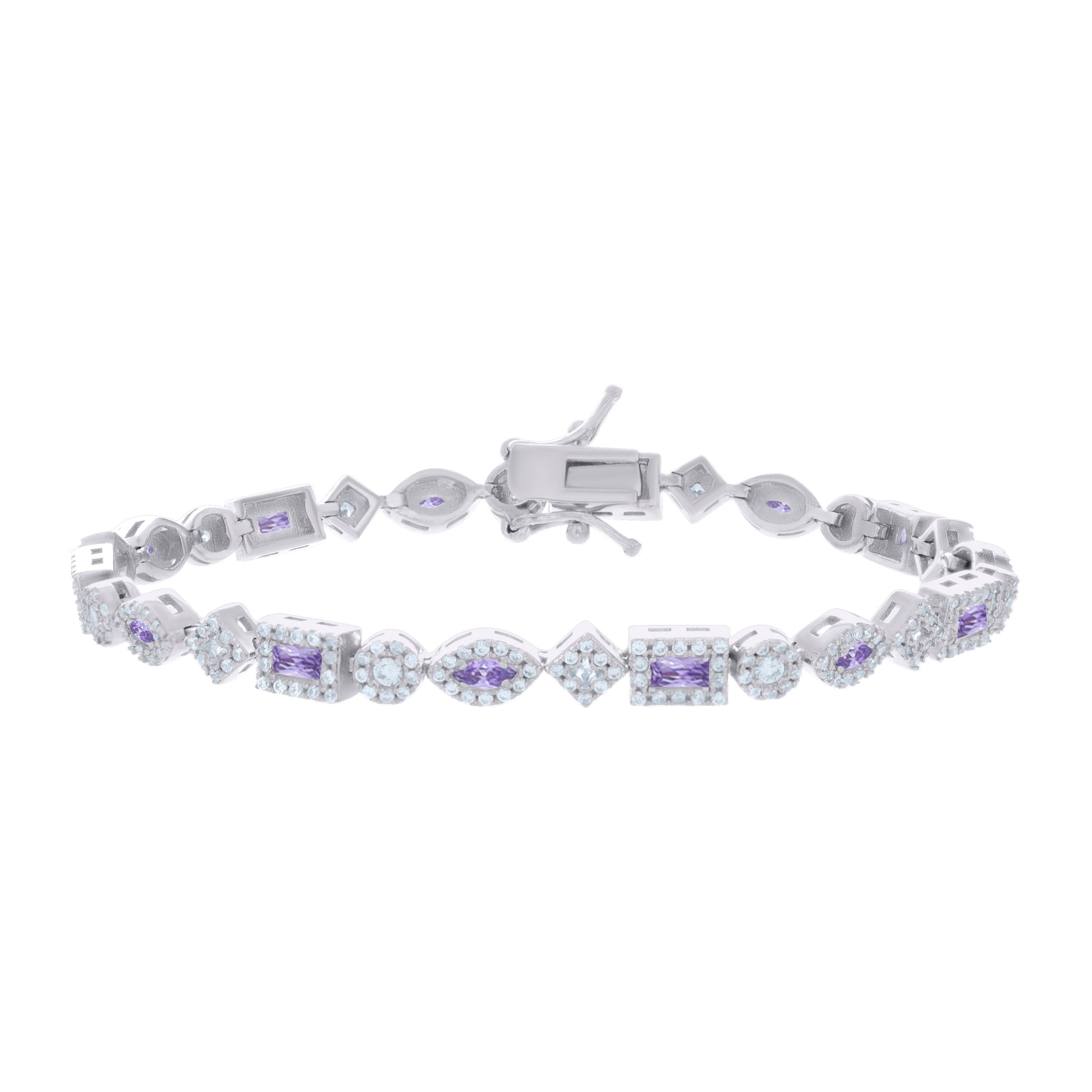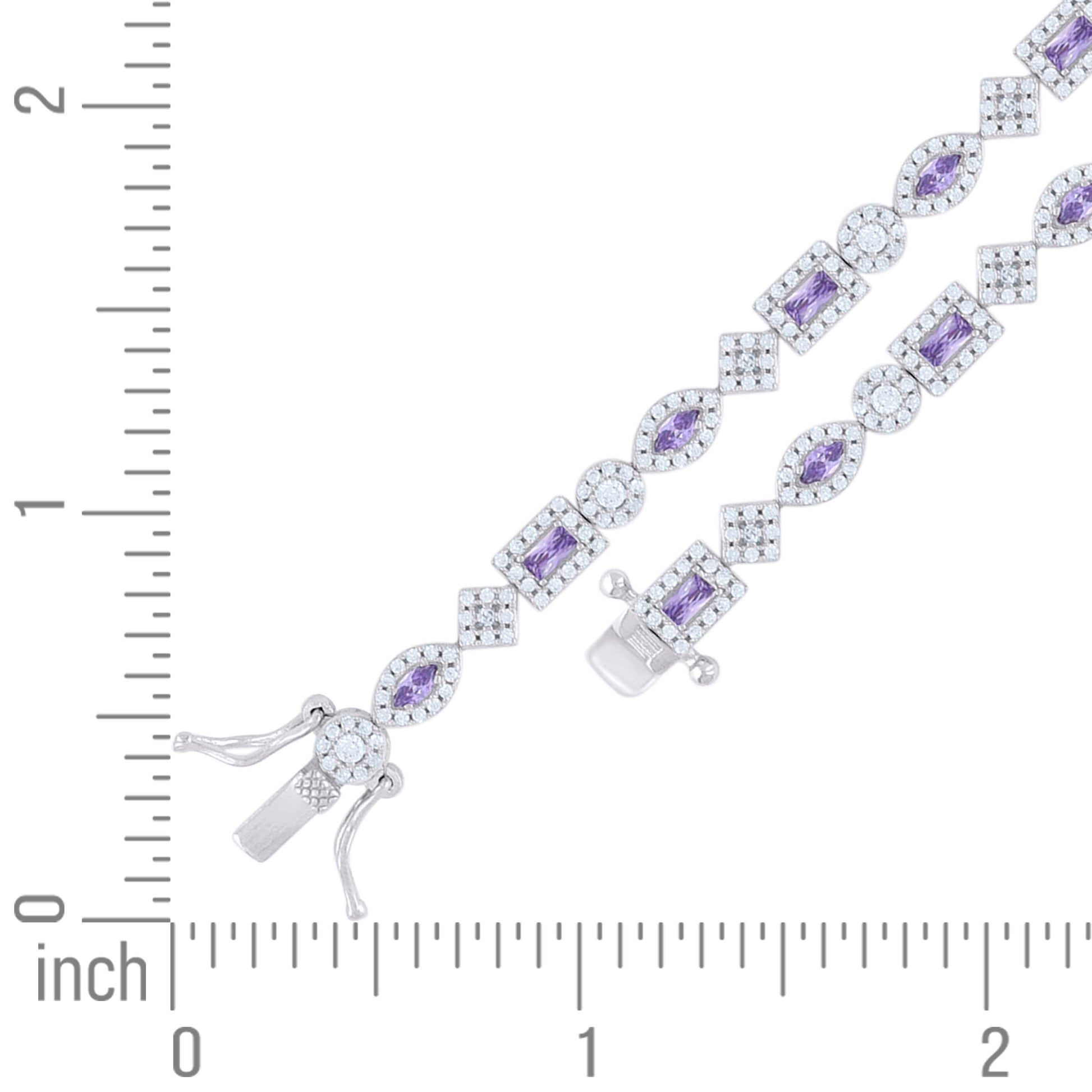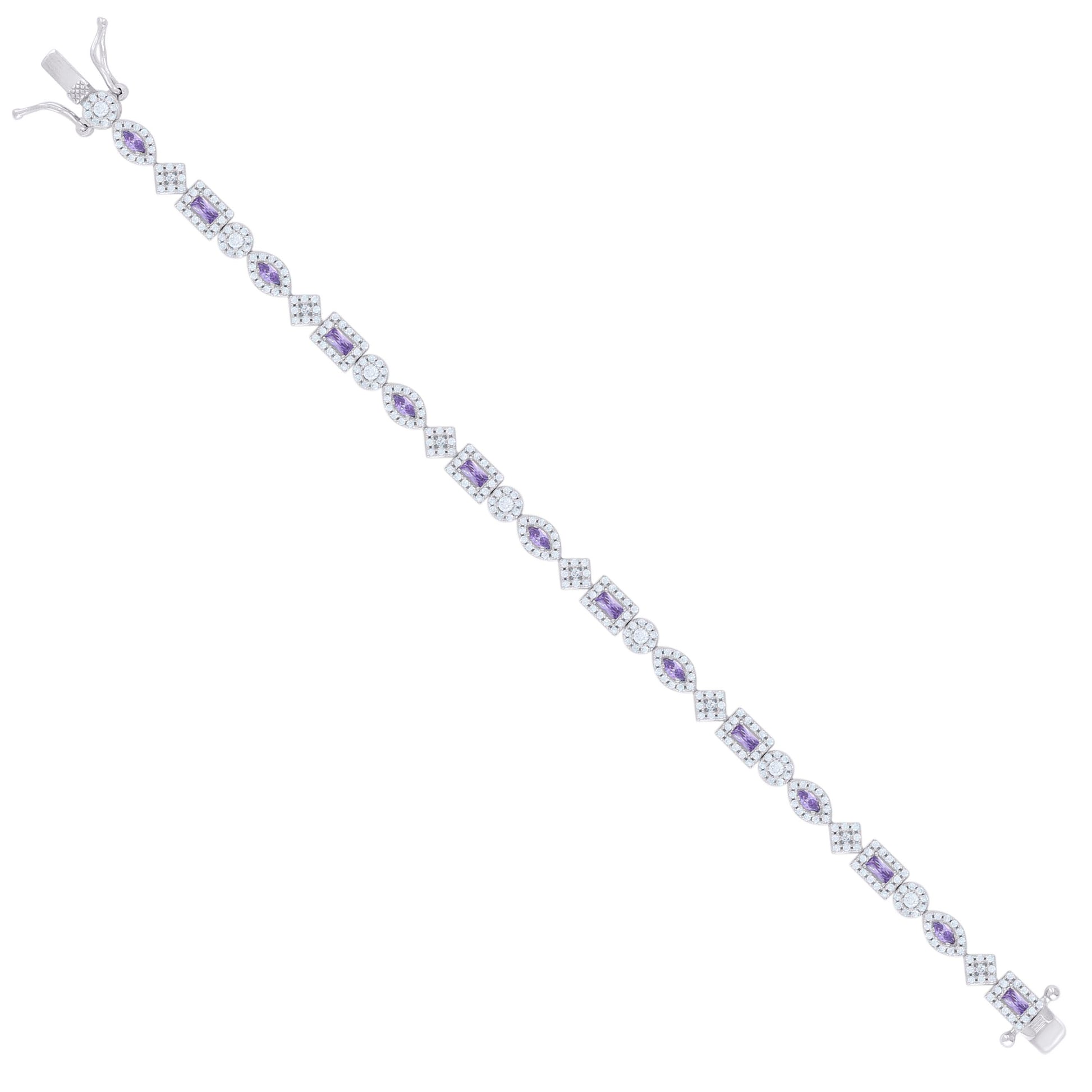 925 Sterling Silver Womens Purple White Baguette/Marquise Round Cubic-Zirconia Fashion Link Bracelet 7