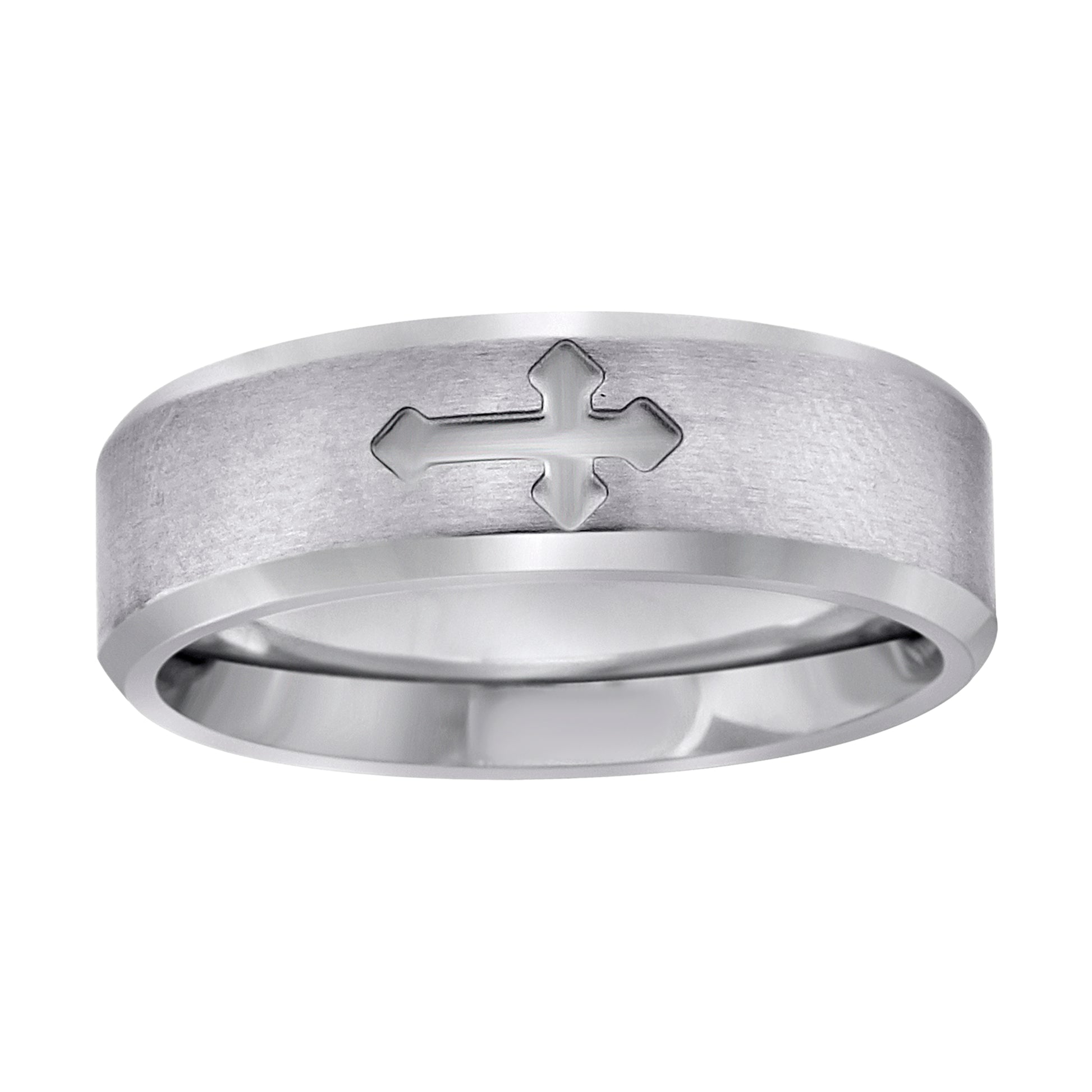 Stainless Steel Mens Center Brushed Cross Beveled Edges Size-7 Comfort-Fit Fashion Band Ring