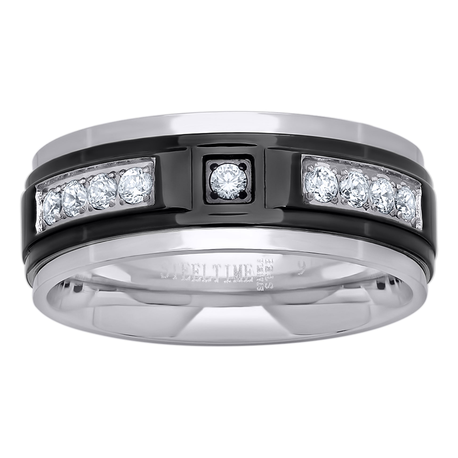 Stainless Steel Mens Two-tone Cubic Zirconia Black Size-9 Comfort-fit Fashion Band Ring