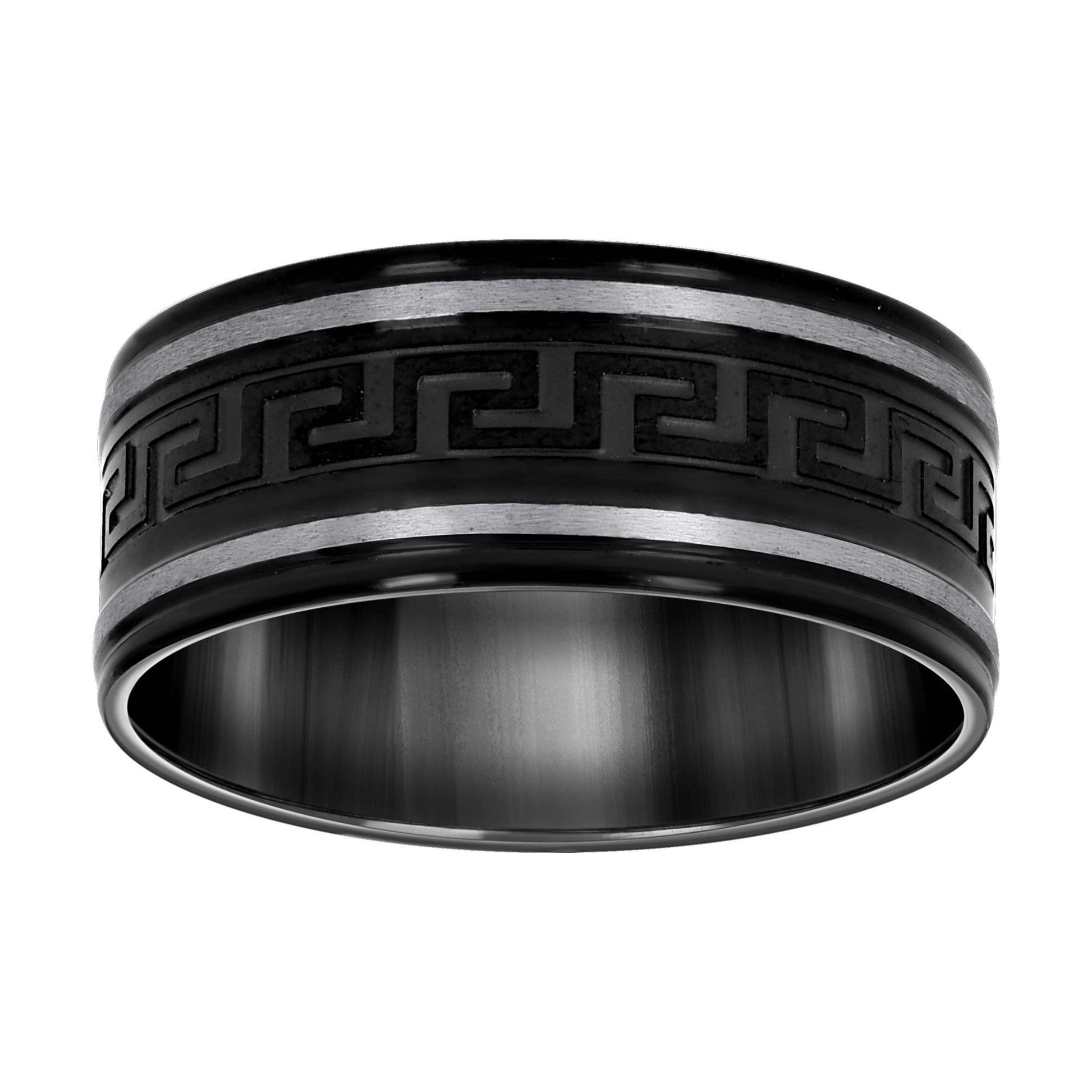 Stainless Steel Mens Two-tone Greek Key Pattern Center Black Size-9 Comfort-fit Fashion Band Ring