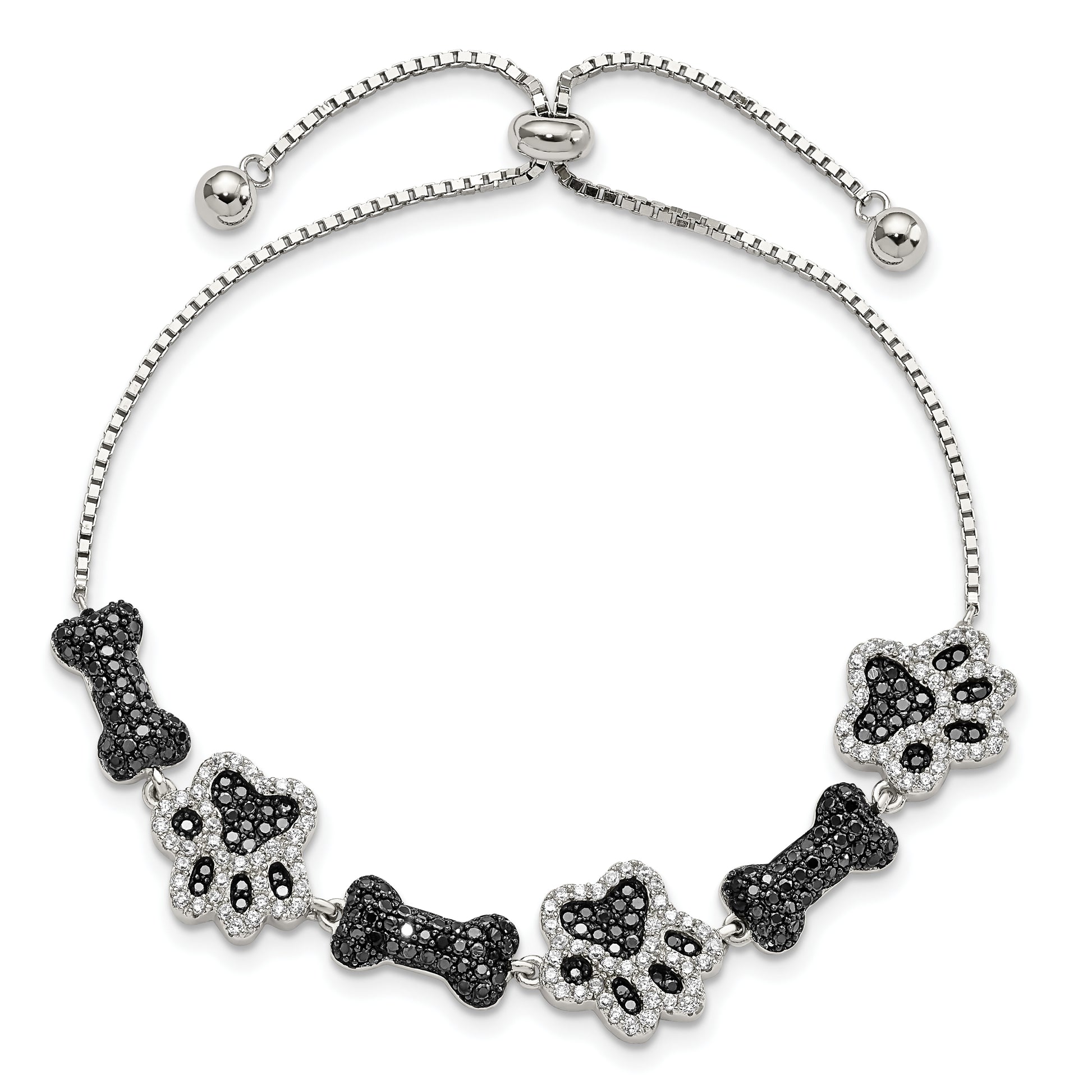 Sterling Silver Rhodium-plated CZ Paw Print & Dog Bone Adj Bracelet