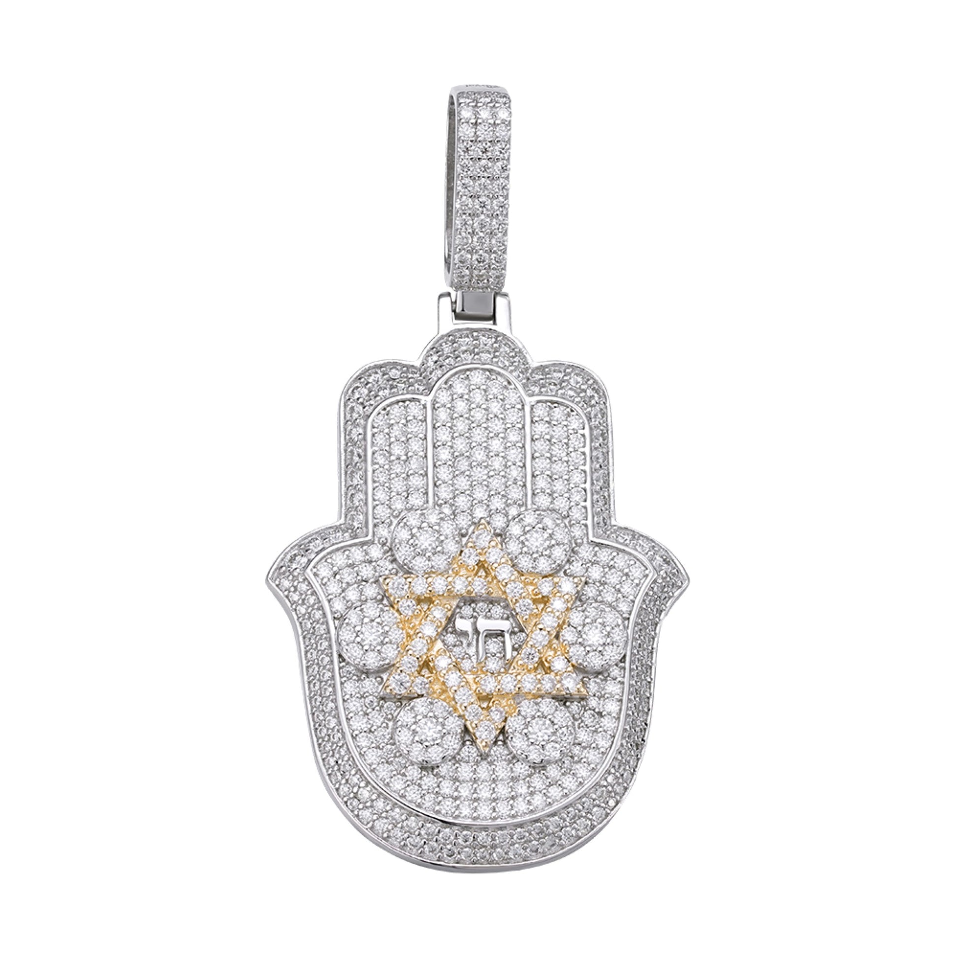 Sterling Silver Round Moissanite Hamza Hand Religious Pendant RP+GP 3-5/8 Cttw