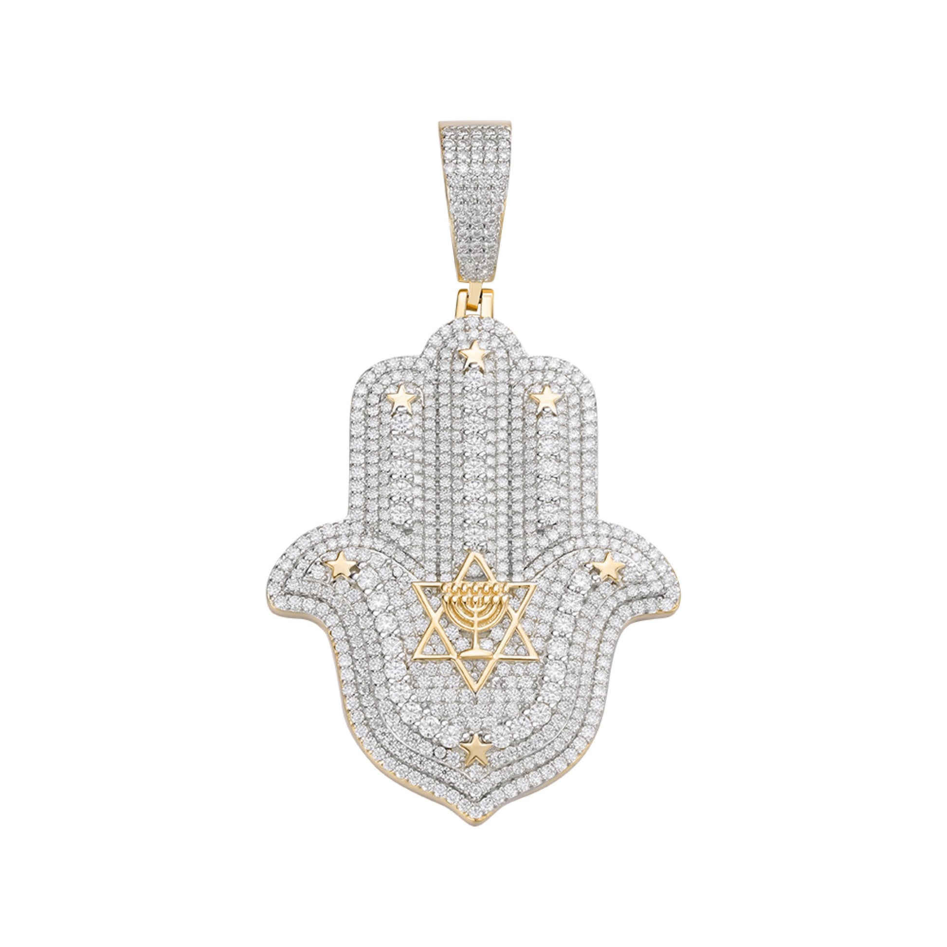 Sterling Silver Round Moissanite Hamza Hand Religious Pendant RP+GP 4-5/8 Cttw